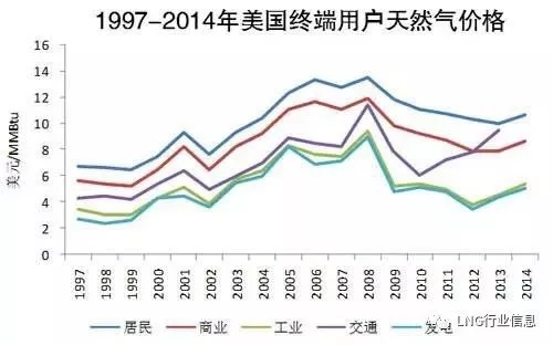 ? 美國:居民用氣價(jià)格最高,超過發(fā)電和工業(yè)用氣價(jià)格的2倍。2014年,居民用氣價(jià)格10.67美元/MMBtu,發(fā)電用氣價(jià)格為5.05美元/MMBtu。