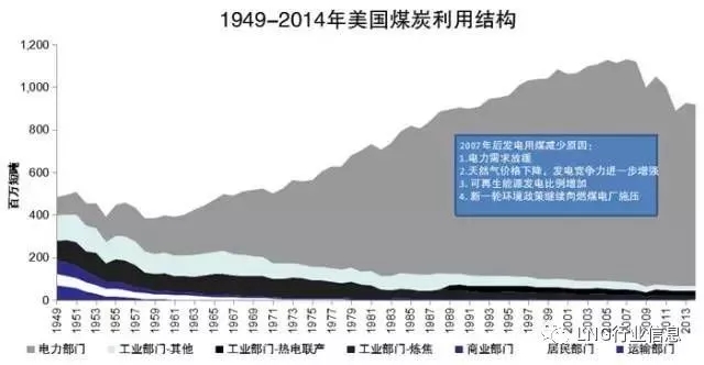 ? 上世紀(jì)50年代,美國煤炭利用以居民、商業(yè)、工業(yè)等部門分散利用為主;1950年后,美國散煤逐步被天然氣替代,用量逐漸減少。煤炭使用逐漸集中于發(fā)電領(lǐng)域,目前發(fā)電用煤占煤炭消費(fèi)總量的90%以上。