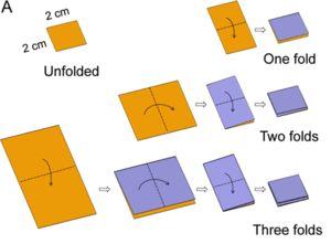 圖A:簡易折疊(一層、兩層、三層);圖B:未折疊的平面電池;圖C:單層折疊的電池