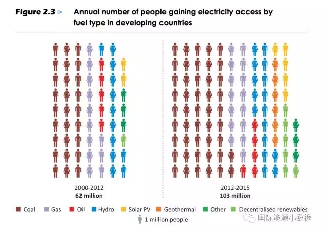 中國儲能網(wǎng)訊:根據(jù)國際能源署最新發(fā)布的能源可及性展望報告(Energy Access Outlook),2000-2015年間發(fā)展中國家共有1.65億無電人口用上了電,其中煤電貢獻為7400萬人(約44%),天然氣發(fā)電貢獻2700萬人(16%),其余6400萬人的通電靠的是各類可再生能源發(fā)電。