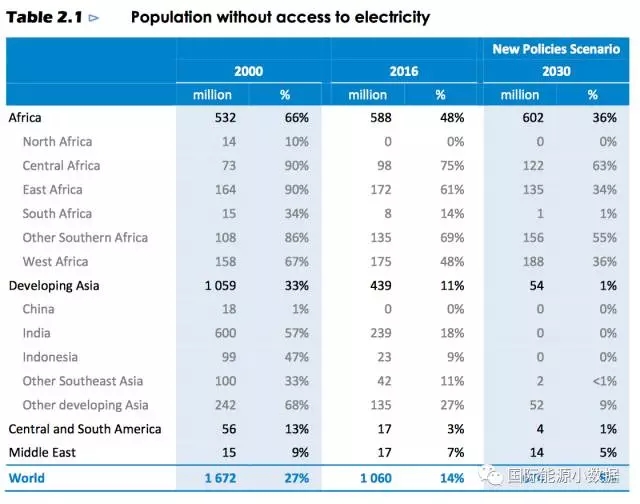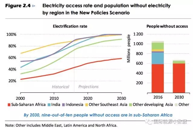 截至2016年全球仍然有10.6億人口沒有用上電(占全球人口的14%),其中非洲有5.88億,亞洲有4.39億(印度2.39億)。按照目前的趨勢和投資計劃,到2030年依然會有6.74億人口無電(占全球人口的8%),主要集中在非洲。
