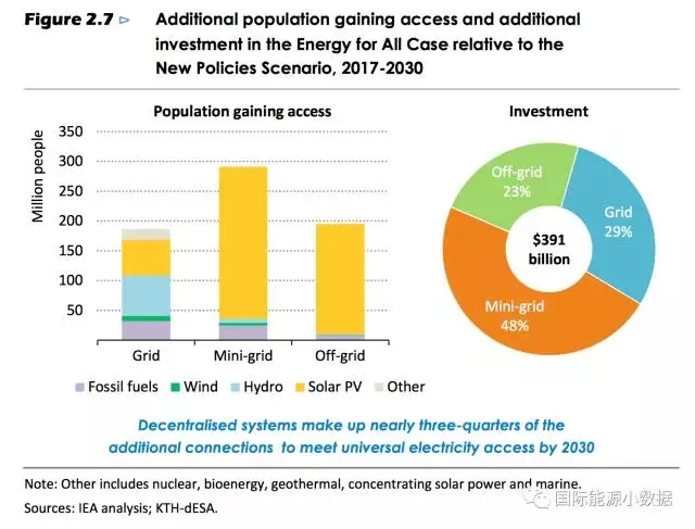 如果要下決心解決這6.74億人口的通電問題,那么未來13年全球需要額外投資3910億美元,通過電網(wǎng)延伸、離網(wǎng)系統(tǒng)和微電網(wǎng)系統(tǒng)三管齊下。由于剩余無電人口多處于邊遠山區(qū)和島嶼,電網(wǎng)延伸勢將遇到瓶頸,預計72%的無電人口(4.85億)要靠離網(wǎng)和微電網(wǎng)系統(tǒng)來解決。