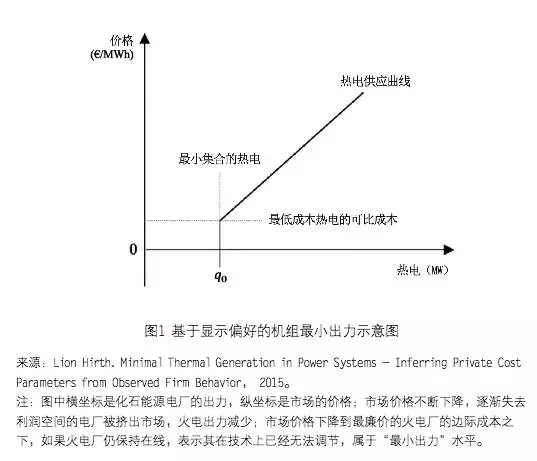 ? 向下的調(diào)峰涉及最小出力問題, 這方面的討論仍舊是非常不透明的。如果系統(tǒng)所有的機(jī)組都實(shí)現(xiàn)了最小出力,那么 證明系統(tǒng)存在嚴(yán)重的供大于求,價格需要大幅跌落,以將盡可能多的出力擠出。電 價不斷下降到低于燃料成本的程度(比如 0.1 元 / 千瓦時—0.15 元 / 千瓦時),靈活 的煤電就寧愿盡可能地停機(jī),而不愿意留在序列里承擔(dān)虧錢的損失了。那么剩下的, 就是的確“往下調(diào)不了”或者不足夠靈活參與下一階段市場的那部分。這種基于“顯 示偏好”的最小出力,往往比測算出的技術(shù)性最小出力要準(zhǔn)確得多(見圖1)。