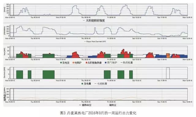 注:從上到下依次是太陽能熱水器的出力、電力市場價格、熱生產(chǎn)與消費(fèi)、電力生產(chǎn)與消費(fèi),以及儲熱罐的儲熱容量變化。這一電廠將在電價高的時候發(fā) 電,余熱儲存;電價極低的時候用電生熱并儲熱。逐小時地變化。來源:EMD International A/S網(wǎng)站。