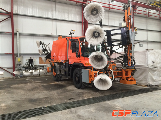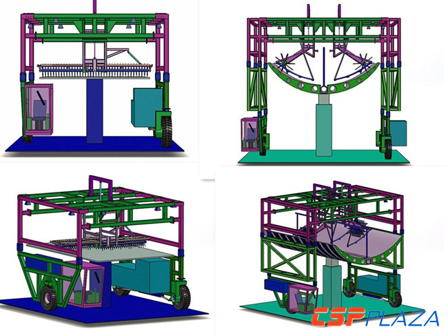 此外,國內(nèi)清洗車供應商寧波跨越太陽能板清洗車有限公司開發(fā)了一款可應用于塔式和槽式光熱電站的跨越式清洗車輛,采用高壓柔條刷滾水洗、高壓吹風和高壓除塵三種組合方式,具有整機結構簡單、操作控制方便、晃動損傷減輕、運行平穩(wěn)高效、轉彎靈活方便及場地利用率高的特點,同時,該公司還自主研發(fā)了適用于沙漠等軟土地面的履帶式龍門清洗車。此外,針對西北地區(qū)寒冷條件下鏡面易結冰的現(xiàn)象,其還提出了采用暖風吹塵干洗的措施。(如下圖所示)