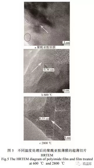 石墨膜局部形態(tài)見圖5,其中白色箭頭方向?yàn)槭┍∧だ炱矫娣较?,可以看出,在聚酰亞胺薄膜前?qū)體中,類似石墨烯片層結(jié)構(gòu)似乎已經(jīng)形成,而且通過預(yù)氧化和碳化后的組織結(jié)構(gòu)具有一定遺傳性,然而聚酰亞胺前驅(qū)體的超分子結(jié)構(gòu)是一線性分子鏈結(jié)構(gòu),通過預(yù)氧化(環(huán)化和交聯(lián)形成 耐熱梯形結(jié)構(gòu))和碳化(交聯(lián)和芳構(gòu)化)后才形成最終類石墨烯片層結(jié)構(gòu),并且類石墨烯片層與類石墨烯片層之間有一定的狹長針狀空隙,這種結(jié)構(gòu)演變規(guī)律是怎樣的,空隙是怎樣影響類石墨烯片層結(jié)構(gòu)形成的,怎樣控制類石墨烯薄膜的厚度和長度,涉及到各個階段的工藝參數(shù)怎樣優(yōu)化,怎樣建立相應(yīng)各個階段的原子排列結(jié)構(gòu)模型,結(jié)構(gòu)和導(dǎo)熱性能的相關(guān)性是怎樣的,要真正弄清這些微觀結(jié)構(gòu)的形成和演變機(jī)制,系統(tǒng)全面的研究工作尚須設(shè)計(jì)和實(shí)施。