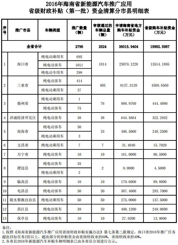 附件:2016年海南省新能源汽車(chē)推廣應(yīng)用省級(jí)財(cái)政補(bǔ)貼資金(第一批)分市縣明細(xì)表