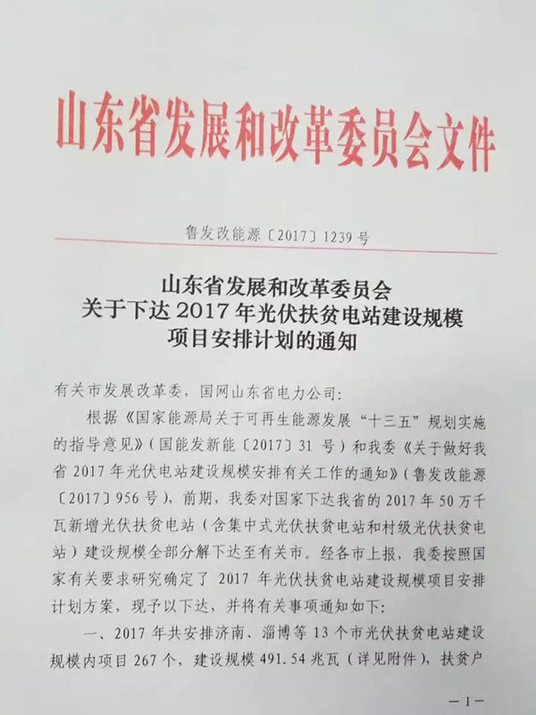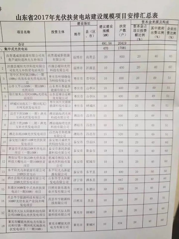 2017年共安排濟南、淄博等13個市光伏扶貧電站建設(shè)規(guī)模內(nèi)項目267個,總規(guī)模491.54MW,計劃扶貧20419戶貧困戶。其中包括:村級光伏扶貧電站229個3338戶共21.54MW;集中式光伏扶貧電站38個17081戶470MW,各項目分得規(guī)模10-30MW不等,具體分配情況見附件。