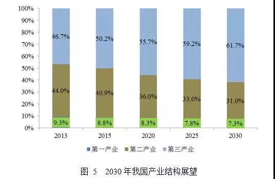 那么,能效情景僅是一個(gè)情景描述嗎?有沒有潛在可達(dá)性?為了回答這個(gè)問題,本文進(jìn)一步研究了我國經(jīng)濟(jì)結(jié)構(gòu)調(diào)整的趨勢(shì)以及各產(chǎn)業(yè)能源消費(fèi)強(qiáng)度下降的潛力。首先,,基于歷史數(shù)據(jù)以及已有研究成果對(duì)我國2030年產(chǎn)業(yè)結(jié)構(gòu)的優(yōu)化情況進(jìn)行了展望(見圖5)。預(yù)計(jì)到2030年,我國第二產(chǎn)業(yè)占GDP的比重將下降到31%左右,而第三產(chǎn)業(yè)的比重將逐步上升到61.7%左右。
