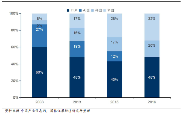 鋰電池隔膜的全球市場份額主要是被日本、美國、韓國、中國占據(jù),但是隨著2015 年美國企業(yè)Celgard 被日本旭化成收購,美國退出鋰電隔膜市場(2015年Celgard 市場份額仍計入美國企業(yè))。隨著近年國內以四川大學為代表的科研院所在鋰電池制備工藝上的突破,再加上生產(chǎn)企業(yè)的大量資金投入,中國在全球鋰電池隔膜市場份額迅速增加,2016年全球隔膜出貨量在33.8億平左右,中國出貨量達到10.84億平,全球市場已經(jīng)達到32%。未來隨著一大批濕法隔膜產(chǎn)能的陸續(xù)投產(chǎn),國信證券預計2020年中國在全球市場的占比將超過60%,實現(xiàn)隔膜全面國產(chǎn)化,并向全球市場出口。