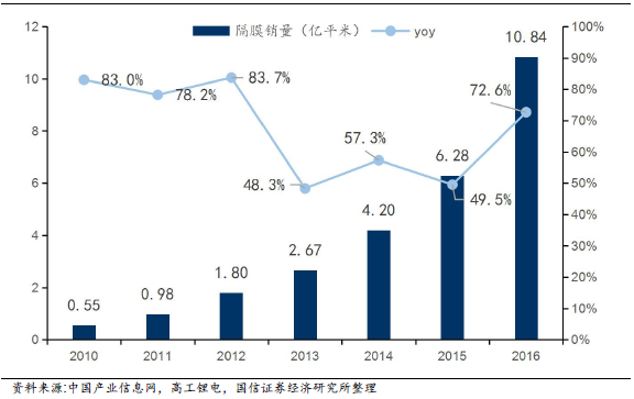 我國發(fā)展鋰電池隔膜技術較國外企業(yè)要晚,從2004年新鄉(xiāng)格瑞恩公司第一條生產(chǎn)線調試成功并產(chǎn)出合格品開始,十幾年間我國企業(yè)在鋰電池隔膜行業(yè)迅速發(fā)展。特別是2010年之后,在新能源汽車產(chǎn)業(yè)鏈的帶動下,鋰電池行業(yè)迅速發(fā)展,我國隔膜銷量從2010 年的0.55億平米迅速增長到2016年的10.84億平米,年復合增長率達到64.3%。