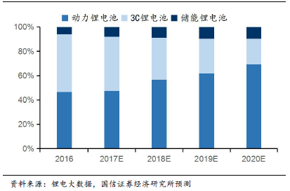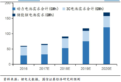 結合對動力電池、3C產(chǎn)品用鋰電池、儲能鋰電池三個領域的需求預測,國信證券預計到2020年國內對鋰電池的需求總量將達到174GWh,這三個領域的占比分別為69.4%、21.0%、9.6%。