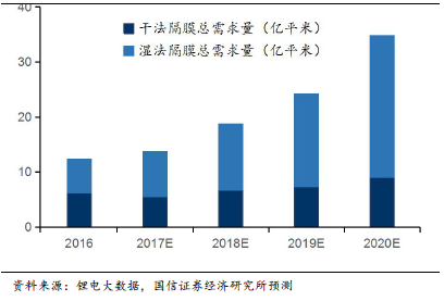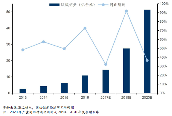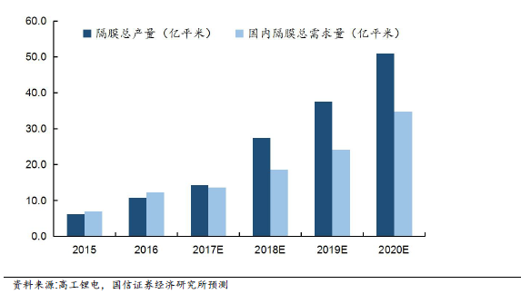 經(jīng)過測算,國信證券預計2017年的隔膜產(chǎn)量在14.3億平米,在未來新增產(chǎn)能投產(chǎn)順利的情況下,2018年國內企業(yè)的隔膜產(chǎn)量有望達到27.5億平米,2020年有望達到51.2億平米。