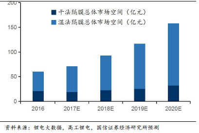 2016年干法和濕法隔膜的市場均價分別為3.0元/平米和4.8元/平米,經(jīng)過涂覆之后,隔膜價格大約能提高2元/平米??紤]到未來國內隔膜產(chǎn)能的迅速擴大,以及干法、濕法的空間占比變化,國信證券保守預計到2020年干法和濕法隔膜的市場均價分別達到2.6元/平米和3.3元/平米,經(jīng)過涂覆后的價格分別為4.3元/平米和4.8元/平米。最終國信證券預計2020年我國隔膜市場空間將達到157.5億元,其中干法和濕法隔膜的市場空間分別為32.5億元和125億元。