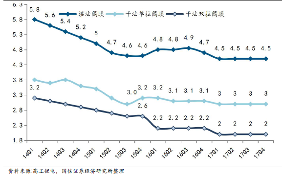 中國鋰電池隔膜平均價格變化(單位:元/平米)