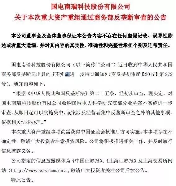 “根據(jù)《中華人民共和國反壟斷法》第二十五條,經(jīng)初步審查,現(xiàn)決定,對國電南瑞科技股份有限公司收購國網(wǎng)電力科學(xué)研究院部分業(yè)務(wù)案不實施進一步審查,從即日起可以實施集中。該案涉及經(jīng)營者集中反壟斷審查之外的其他事項,依據(jù)相關(guān)法律辦理。”