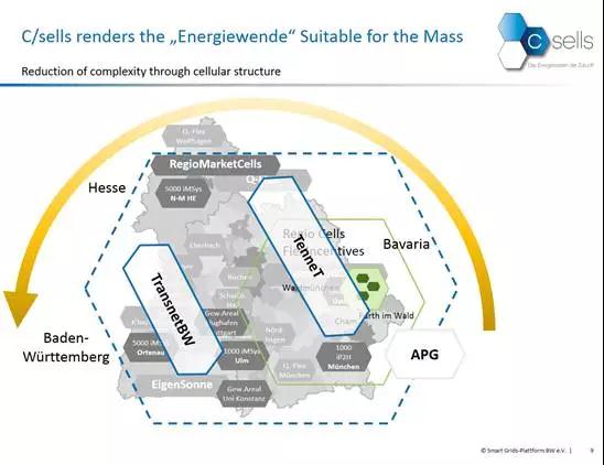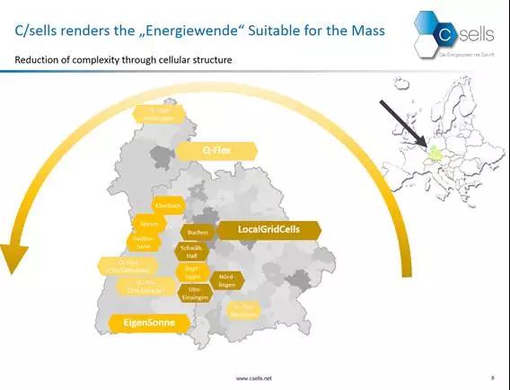 “C-sells”的目標(biāo)是通過數(shù)字化基礎(chǔ)設(shè)施(發(fā)電、配電、儲(chǔ)能、地產(chǎn))實(shí)現(xiàn)分散結(jié)構(gòu)的大規(guī)模生產(chǎn),從而實(shí)現(xiàn)生態(tài)進(jìn)步和經(jīng)濟(jì)附加值。C-sell項(xiàng)目選址在德國南部的巴伐利亞州、巴登 - 符騰堡州和黑森州,覆蓋了德國重要的工業(yè)負(fù)荷中心如斯圖加特、萊茵-內(nèi)卡區(qū)域、大慕尼黑地區(qū),涵蓋2602個(gè)城鎮(zhèn),3000萬人口,80萬個(gè)能源用戶。目前,核電是該地區(qū)的能源供應(yīng)的重要來源之一,約占30%。但是,根據(jù)德國政府的計(jì)劃,要在2022年前關(guān)閉德國全部核反應(yīng)堆。所以在這片區(qū)域內(nèi),如何將太陽能、生物質(zhì)能和水力等清潔能源納入到現(xiàn)有的能源系統(tǒng)中,是一個(gè)重要的課題。