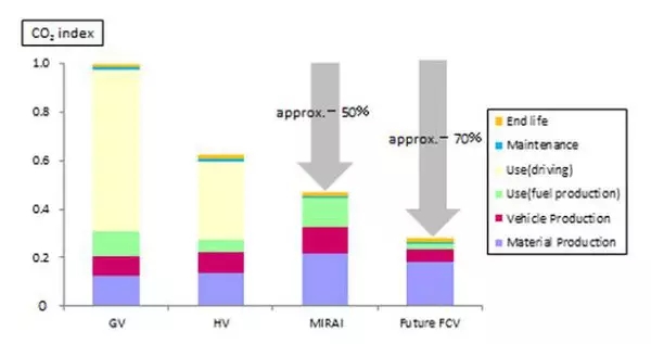 豐田公司指出,燃料電池汽車制造階段的碳排放占整個(gè)生命周期的碳排放的比例很小,約為10%~15%。這兩種類型的電動(dòng)車相比與傳統(tǒng)汽油車在制造階段的碳排放都稍高一點(diǎn)。然而電動(dòng)車在運(yùn)行階段的低耗能足以彌補(bǔ)制造階段的碳排放赤字,這也意味著從整個(gè)生命周期看,這兩種電動(dòng)汽車的碳排放遠(yuǎn)遠(yuǎn)低于使用內(nèi)燃機(jī)的傳統(tǒng)汽車的碳排放。