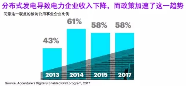 埃森哲近期一項全球調(diào)研顯示,有58% 的公用事業(yè)企業(yè)認為分布式發(fā)電將使本企業(yè)收入下降,44% 的公用事業(yè)企業(yè)認為微電網(wǎng)會影響本企業(yè)收入 。尤其在亞太地區(qū),傳統(tǒng)企業(yè)對分布式能源的這種抵觸情緒更強烈。