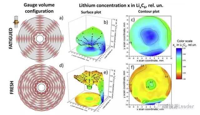 中子衍射技術(shù)是一種利用不同材料對(duì)中子輻射的遮擋率不同,對(duì)材料進(jìn)行分析的技術(shù),憑借著中子輻射強(qiáng)大的穿透力,我們能夠在不破壞鋰離子電池結(jié)構(gòu)的前提下對(duì)鋰離子電池內(nèi)部Li的分布進(jìn)行原位的分析研究。來(lái)自德國(guó)Helmholtz化學(xué)儲(chǔ)能研究所(HIU)和卡爾斯魯厄理工學(xué)院的M.J. Mu?hlbauer等【2】利用中子衍射技術(shù)對(duì)電池衰降對(duì)電池中Li資源分布的影響進(jìn)行了研究,發(fā)現(xiàn)隨著電池老化,不僅僅電池內(nèi)可利用的Li資源在減少,Li在電池的直徑方向還出現(xiàn)了較為明顯的分布不均勻的現(xiàn)象。