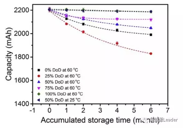 下圖為不同放電深度DOD下的電池在存儲(chǔ)不同時(shí)間后的剩余容量,可以看到在存儲(chǔ)6個(gè)月后,放電深度為0%,25%,50%和75%的電池的容量損失率分別為9.7%、17.2%、7.3%和0.9%,而50%DOD的電池在25攝氏度下存儲(chǔ)6個(gè)月,容量損失為1%。從結(jié)果可以看到放電深度DOD對(duì)于電池的存儲(chǔ)容量衰降具有顯著的影響,75%DOD的電池在存儲(chǔ)過(guò)程中容量衰降是最少的,同樣的溫度也是影響鋰離子電池存儲(chǔ)容量衰降的重要因素,25℃下鋰離子電池的容量衰降要明顯低于60℃下存儲(chǔ)的電池。