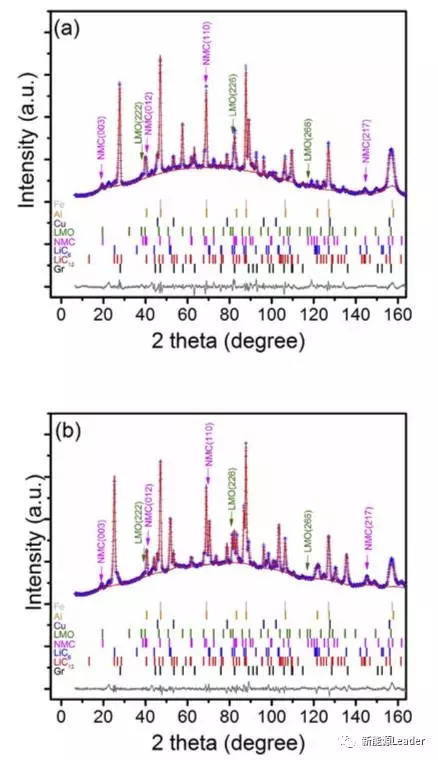 在高分辨率中子衍射技術(shù)的幫助下,Po-Han Lee對(duì)完全充電狀態(tài)和完全放電狀態(tài)下的電池進(jìn)行了原位分析,結(jié)果如下圖所示,可以看到充電狀態(tài)下,LMO晶體的a值,以及NMC晶體的a值和c值都和新電池幾乎一直,但是在完全放電的狀態(tài)下LMO和NMC的a值要小于新電池的值,但是NMC材料的c值卻要高于新電池(活性L(fǎng)i 的損失),LMO材料a值減小主要是因?yàn)樵谳^高的電勢(shì)下儲(chǔ)存導(dǎo)致的Mn2+元素的溶解引起的活性L(fǎng)MO材料損失造成的。