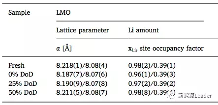 Po-Han Lee根據(jù)中子衍射結(jié)果得出的不同放電深度的電池總正極材料的晶格結(jié)構(gòu)變化和Li含量的變化,從下表中可以看到25%DOD(75%SoC)電池在存儲(chǔ)過(guò)程中活性L(fǎng)i和NMC的損失最為嚴(yán)重,并且LMO的損失也較為嚴(yán)重。而在0%DOD(100%SoC)電池在存儲(chǔ)后LMO材料的a值下降最為嚴(yán)重,這意味著在存儲(chǔ)的過(guò)程中LMO材料的損失也最為嚴(yán)重,而活性L(fǎng)i和NMC的損失僅次于25%DOD(75%SoC)的電池。