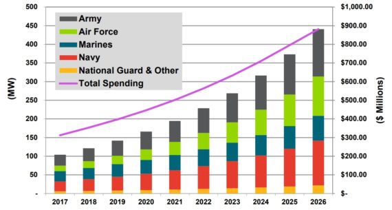 中國儲能網(wǎng)訊:美國市場研究機構(gòu)Navigant Research日前發(fā)布報告稱,作為全球最大的石油消費國,美國國防部預(yù)計將部署軍用微電網(wǎng)以維持其運營,預(yù)計到2026年,軍用微電網(wǎng)每年支出將達到14億美元。
