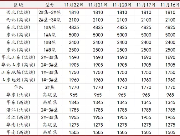 11月22日各地區(qū)石油焦價格情況(元/噸)