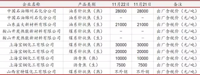 11月22日,針狀焦價格高度持平。中國是有錦州石化分公司油系針狀焦(熟)28000元/噸,油系針狀焦(生)暫不報價。山東益大新材料有限公司油系針狀焦(生)21000元/噸。上海寶鋼化工有限公司煤系針狀焦(熟)30000元/噸,煤系針狀焦(生)20000元/噸。上海寶鋼化工有限公司瀝青焦(熟)10000元/噸,瀝青焦(生)7500元/噸。(百川資訊)