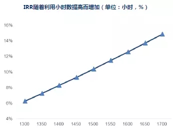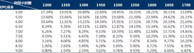固定利用小時(shí)數(shù),隨著EPC成本提升,內(nèi)部收益率隨之下降。例如,當(dāng)利用小時(shí)數(shù)固定為1600小時(shí)數(shù)時(shí),EPC成本越小,IRR越高。例如,當(dāng)EPC成本為5元/W時(shí),IRR為28.21%,隨著EPC成本增長至9元/W,IRR下降至5.29%。具體如下圖所示: