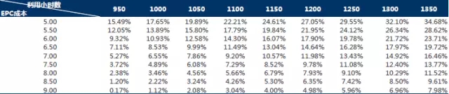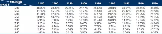 固定EPC成本,隨著利用小時(shí)數(shù)提高,內(nèi)部收益率隨之增長。例如,當(dāng)EPC成本固定為7元/W時(shí),利用小時(shí)數(shù)平均每提升50小時(shí),IRR約增長1%。