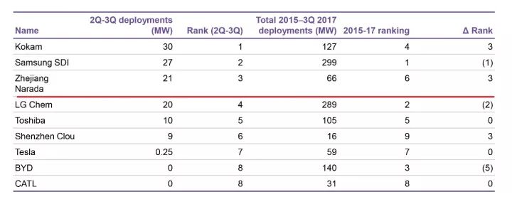 彭博社2017年前三季度儲(chǔ)能投運(yùn)規(guī)模榜單,主要根據(jù)企業(yè)近期投運(yùn)的儲(chǔ)能項(xiàng)目規(guī)模進(jìn)行排名。