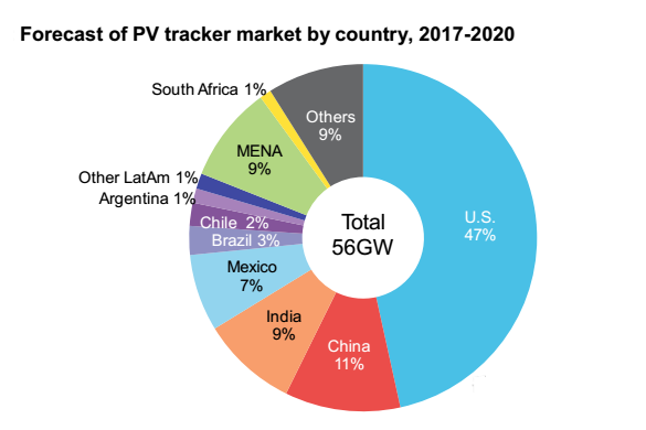 在彭博社的報告中指出,2016年全球太陽能跟蹤支架總出貨量24.7GW,其中美國占78%,其它國家共占22%,而在2017年美國占比59%,其它國家共同占比41%,隨著本土政府向光伏的傾斜,光照資源好的地區(qū)如拉美、中東、非洲都將成為太陽能跟蹤系統(tǒng)的新興市場,主要集中在墨西哥、巴西、智利、阿根廷、約旦等國。