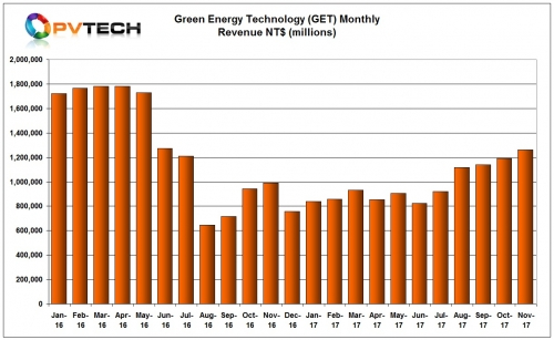 中國儲能網(wǎng)訊:臺灣P型多晶硅片生產(chǎn)商綠色能源科技公司(GET)稱,由于年中需求持續(xù)強勁,2017年11月,銷售額保持穩(wěn)健上升趨勢。