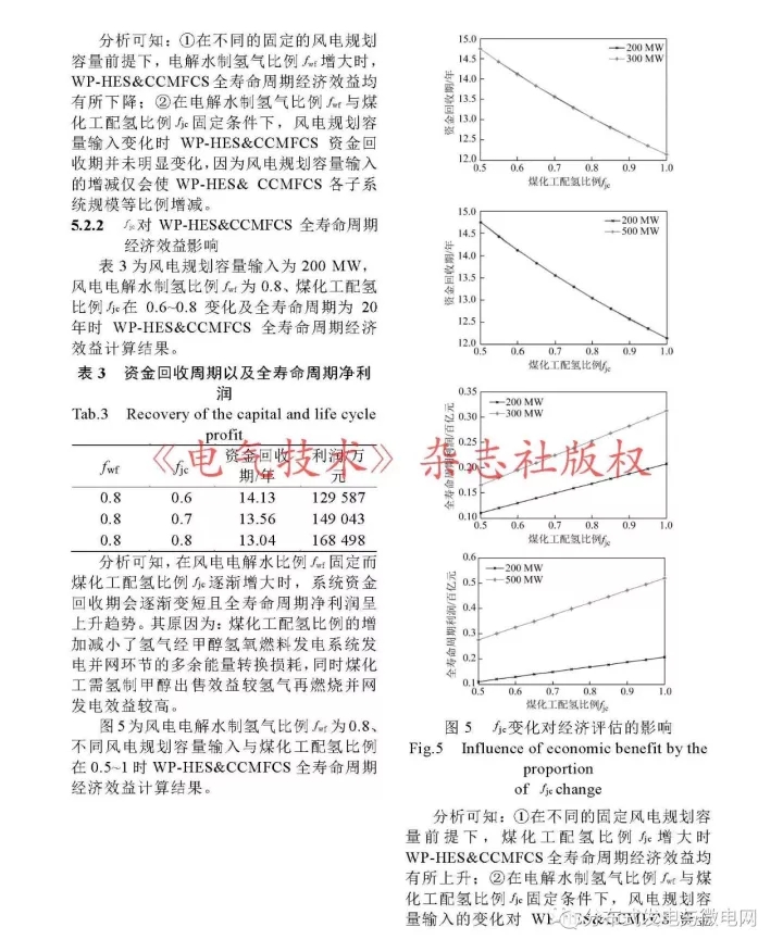 首先,闡述了多能耦合系統(tǒng)集成方案;其次,以多能耦合系統(tǒng)全壽命周期凈利潤為目標(biāo),以風(fēng)電盡可能多的消納與WP-HES&CCMFCS能量流動和穩(wěn)定運行為約束,構(gòu)建了多能耦合系統(tǒng)全壽命周期經(jīng)濟評估數(shù)學(xué)模型,并對多能耦合系統(tǒng)資金回收期及全壽命周期凈利潤進行求解;最后,以新疆地區(qū)某風(fēng)電場與煤化工企業(yè)為背景仿真計算了所提的風(fēng)電-氫儲能與煤化工多能耦合系統(tǒng)全壽命周期經(jīng)濟評估模型,并分析了不同風(fēng)電并網(wǎng)比例與風(fēng)電非電形態(tài)消納比例條件下系統(tǒng)資金回收期與全壽命周期凈利潤變化規(guī)律。