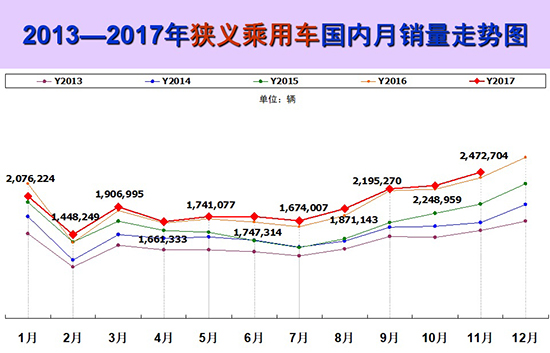 12月8日,全國乘用車市場信息聯(lián)席會(以下簡稱“乘聯(lián)會”)發(fā)布數(shù)據(jù)顯示:2017年11月我國狹義乘用車銷量為2472704輛,同比增長3.9%,環(huán)比漲幅為9.9%;綜合前11個月數(shù)據(jù),1-11月我國狹義乘用車累計銷量突破2千萬輛,達到21027530輛,同比增長2.3%。