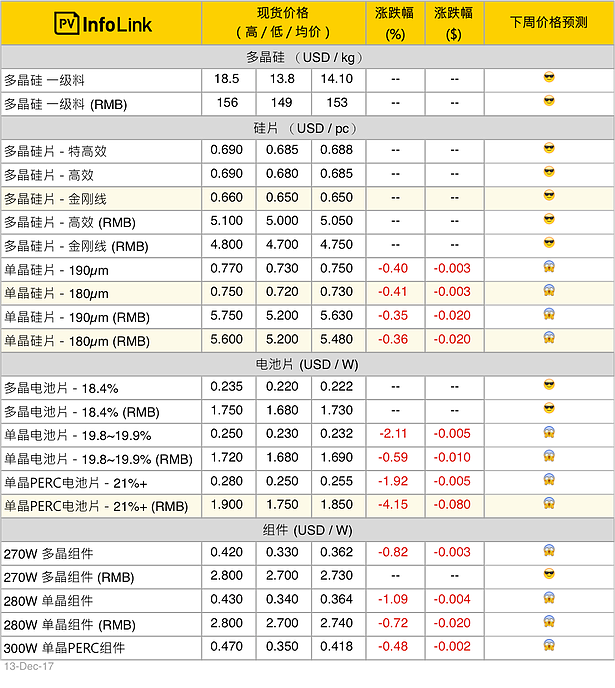 受到中下游單晶產(chǎn)品需求不振影響,單晶硅片在12月逐漸面臨銷售以及庫存壓力,本周國內(nèi)規(guī)模較小的單晶硅片廠商陸續(xù)開始拋售單晶硅片、盼庫存不要繼續(xù)積壓,故雖然主流龍頭廠價格仍維持在180μm厚度每片5.5元人民幣左右,但國內(nèi)二線廠已降到5.2 – 5.4元人民幣,且預(yù)期跌勢仍將持續(xù)。海外單晶硅片價格則受到成交量冷清影響,180μm厚度主流報價已跌至每片0.72-0.735元美金。