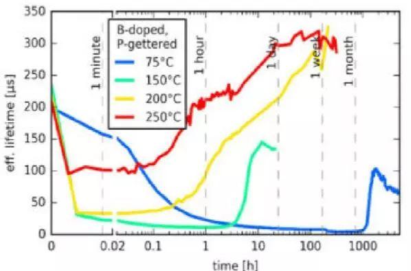 在制成電池之前,通過(guò)吸雜可以有效降低電池的光衰,包括磷吸雜、鋁吸雜和磷鋁吸雜三種;此外,降低燒結(jié)溫度,以及減緩燒結(jié)的升降溫過(guò)程,也有利于降低光衰,這是由于在高溫下金屬沉淀溶解導(dǎo)致金屬離子擴(kuò)散,形成較多的復(fù)合中心,快速冷卻會(huì)使得金屬離子“凍結(jié)”在晶格中形成較強(qiáng)的復(fù)合中心,導(dǎo)致光衰較強(qiáng),而慢速冷卻可以使金屬離子。