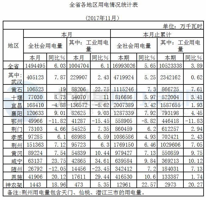 (五)全省各地區(qū)全社會(huì)用電絕大部分增長(zhǎng),工業(yè)用電起到重要拉動(dòng)作用。全省14個(gè)用電統(tǒng)計(jì)地區(qū)中11個(gè)地區(qū)全社會(huì)用電不同程度增長(zhǎng),其中黃石、咸寧等4個(gè)地區(qū)全社會(huì)用電增幅超過兩位數(shù);武漢、襄陽等7個(gè)地區(qū)全社會(huì)用電平穩(wěn)較快增長(zhǎng)。武漢市當(dāng)月全社會(huì)用電40.51億千瓦時(shí),占全省用電量的27.11%,同比增長(zhǎng)7.87%,高于全省平均水平1.84個(gè)百分點(diǎn),起到重要穩(wěn)定和帶頭作用;從工業(yè)用電情況來看,黃石、十堰等5個(gè)地區(qū)用電呈兩位數(shù)以上增長(zhǎng),武漢、襄陽等6個(gè)地區(qū)平穩(wěn)較快增長(zhǎng)。受當(dāng)?shù)禺a(chǎn)業(yè)結(jié)構(gòu)調(diào)整因素影響,宜昌、鄂州、隨州3地當(dāng)月全社會(huì)和工業(yè)用電出現(xiàn)下降。