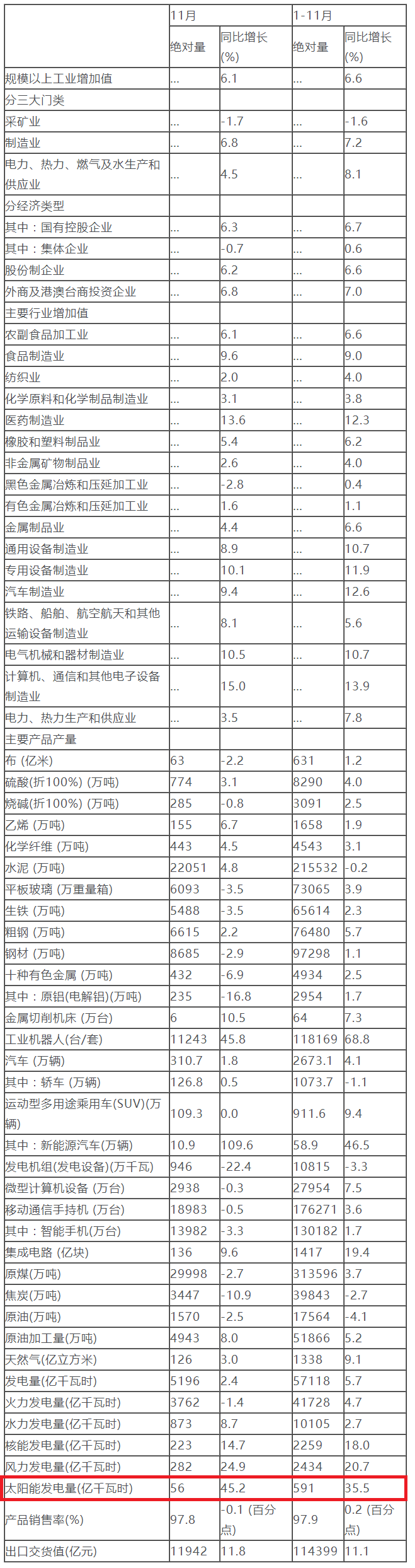 其中,11月,我國(guó)太陽(yáng)能發(fā)電量56億千瓦時(shí),同比增長(zhǎng)45.2%。1-11月太陽(yáng)能發(fā)電量591億千瓦時(shí),同比增長(zhǎng)35.5%。
