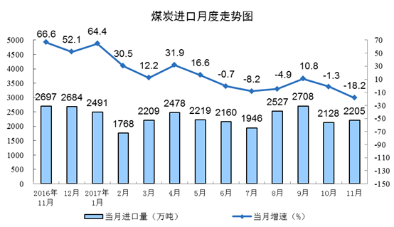 11月份,進口煤炭2205萬噸,同比下降18.2%,降幅比10月份擴大16.9個百分點。1-11月份,進口煤炭2.5億噸,同比增長8.5%。