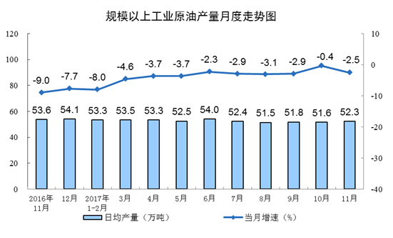 原油生產(chǎn)降幅擴大。11月份,原油產(chǎn)量1570萬噸,同比下降2.5%,降幅比10月份擴大2.1個百分點;日均產(chǎn)量52.3萬噸,同比減少1.3萬噸。1-11月份,原油產(chǎn)量1.8億噸,同比下降4.1%。