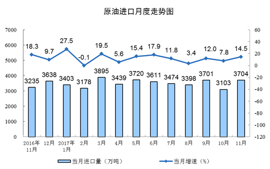 原油進口增速加快。11月份,進口原油3704萬噸,同比增長14.5%,增速比10月份加快6.7個百分點。1-11月份,進口原油3.9億噸,同比增長12.0%。