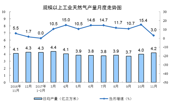 天然氣生產(chǎn)繼續(xù)增長,但增速有所回落。11月份,天然氣產(chǎn)量126.3億立方米,同比增長3.0%,受同期基數(shù)較高影響,增速比10月份回落12.4個百分點;日均生產(chǎn)4.2億立方米,同比增加0.1億立方米。1-11月份,天然氣產(chǎn)量1338.1億立方米,同比增長9.1%。
