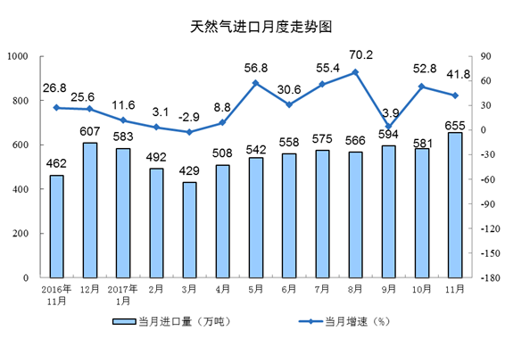 天然氣進口快速增長。11月份,進口天然氣655萬噸,同比增長41.8%,增速比10月份放緩11.0個百分點。1-11月份,進口天然氣6070萬噸,同比增長26.5%。