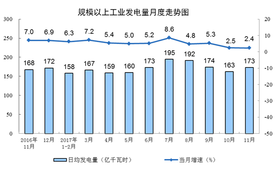 11月份,核能、風力和太陽能發(fā)電保持了較快增長,同比分別增長14.7%、24.9%和45.2%,增速比10月份分別回落0.5個百分點和加快13.2、9.5個百分點。