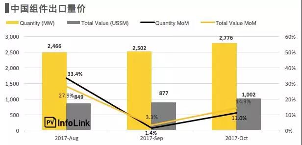 據(jù)PVInfolink 最新的海關(guān)出口報(bào)告顯示,十月中國(guó)組件及電池片的出口量分別為2,776MW及349MW,較九月有11%及9.5%的增加。
