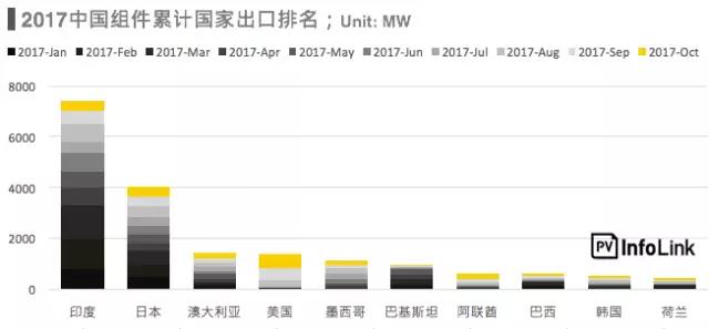 中國(guó)每月電池片出口量持續(xù)穩(wěn)定的增加,截至十月由中國(guó)出口之電池片總量已接近2.7GW,以印度、韓國(guó)及巴西為主要出口目的國(guó),其中出口至印度的電池片累計(jì)總量已達(dá)974MW,預(yù)期十一月即可突破1GW的累計(jì)出口量,而韓國(guó)也已突破500MW的出口量,巴西則達(dá)480MW。