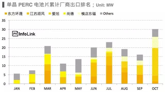 不僅整體出口增加,高效電池片的出口也由三季度每月約15-25MW的出口量,成長(zhǎng)至32.3MW。目前高效電池片仍以單晶PERC為最主要出口產(chǎn)品,PERC電池片的出口增加,不僅是因中國(guó)國(guó)內(nèi)對(duì)高效產(chǎn)品的需求已隨今年領(lǐng)跑者項(xiàng)目的結(jié)束而減弱,主要原因還是更多的廠(chǎng)商加入高效電池片的戰(zhàn)局。